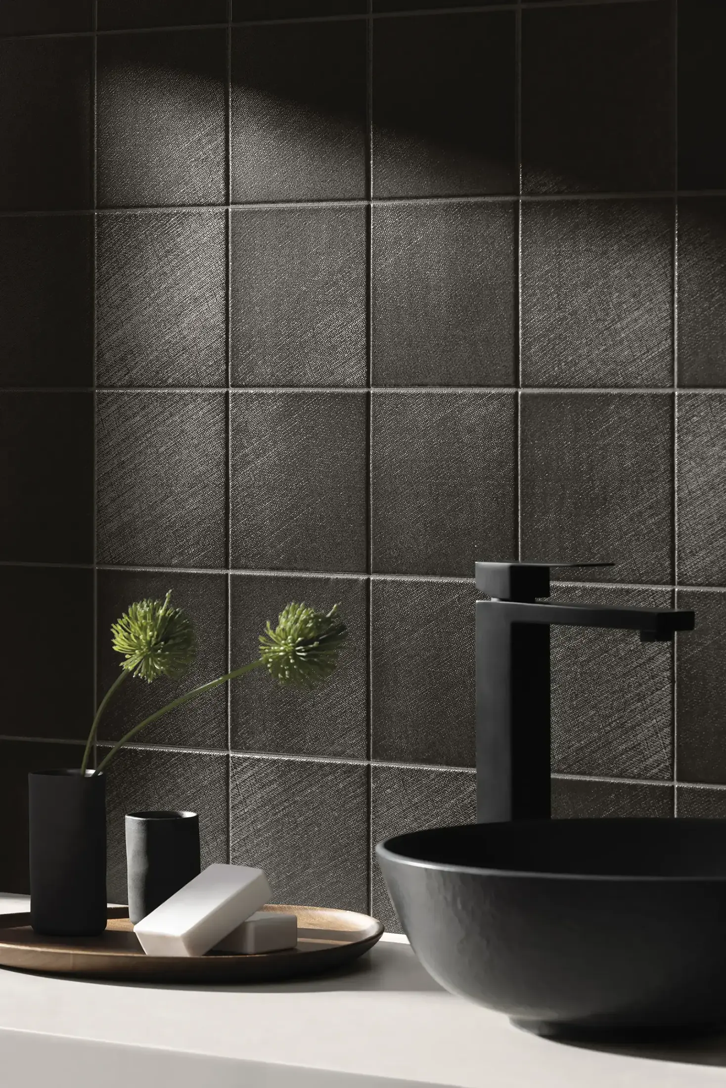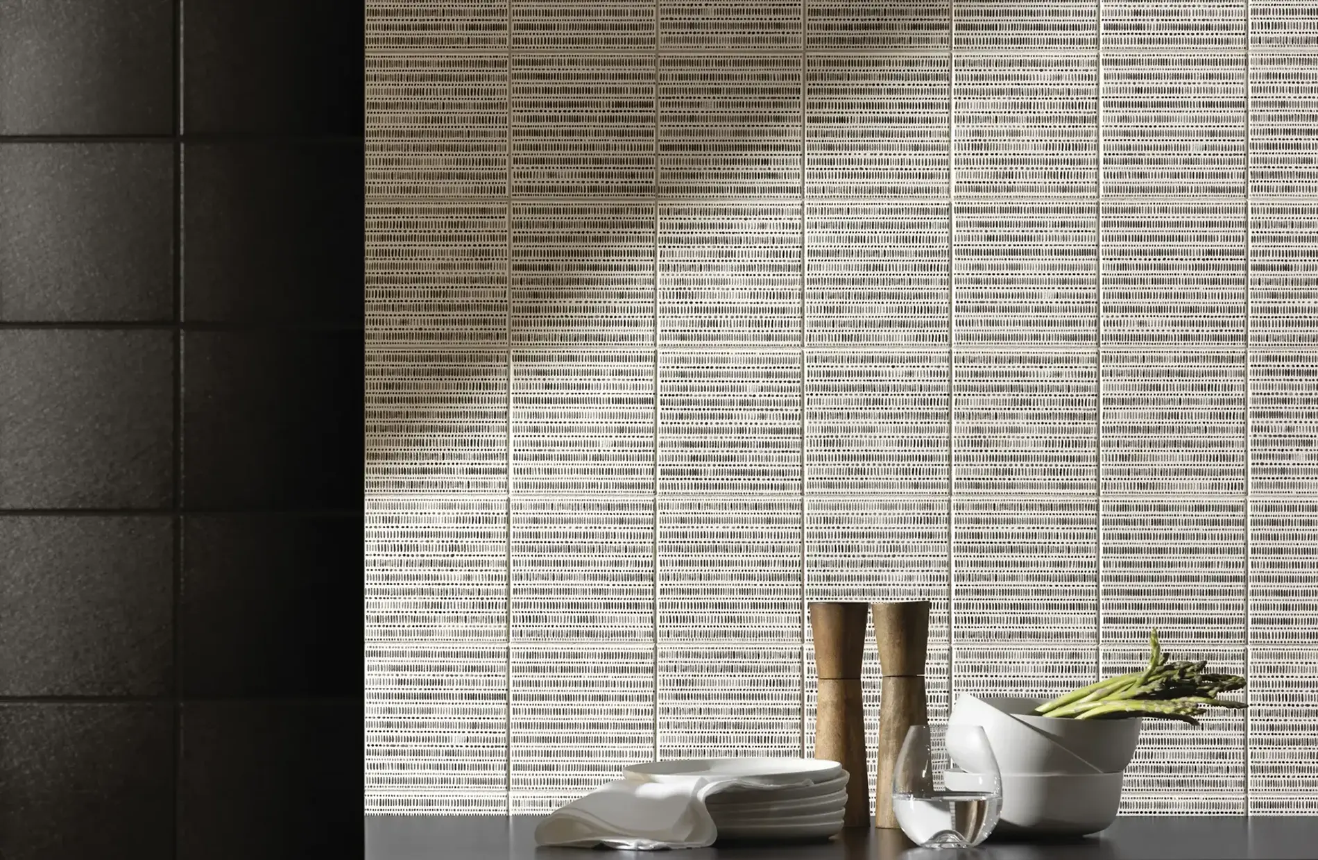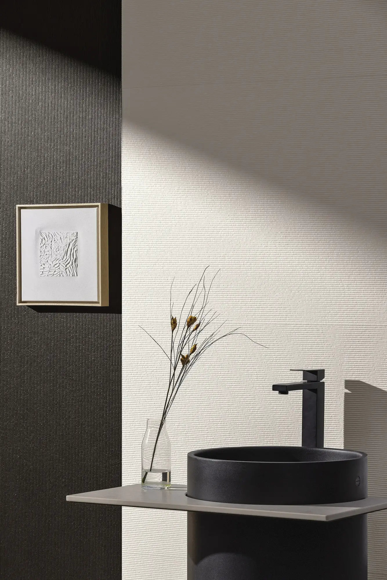 A highly resolved system of reliefs, finishes, and mosaics, translating advanced porcelain technology into unusual depth, versatility, and material presence. Working within an essential palette, it shifts attention from color to the expressive power of surface, where texture, gloss, grain, and form come together in a sensorial language that expands compositional freedom and brings a bold architectural character to contemporary interiors.